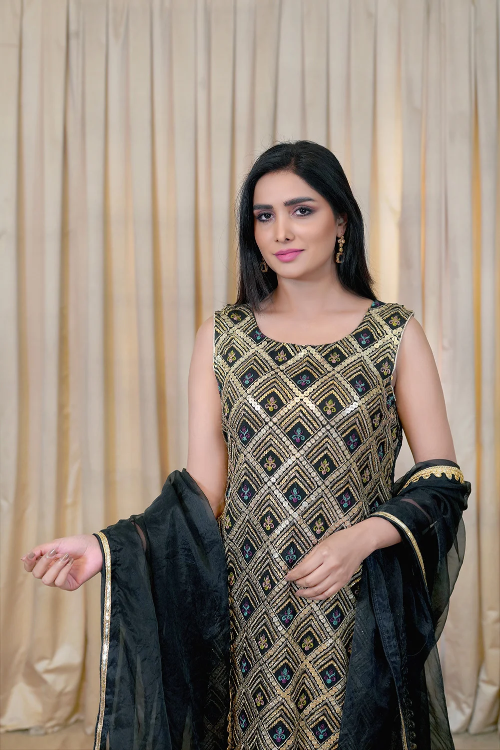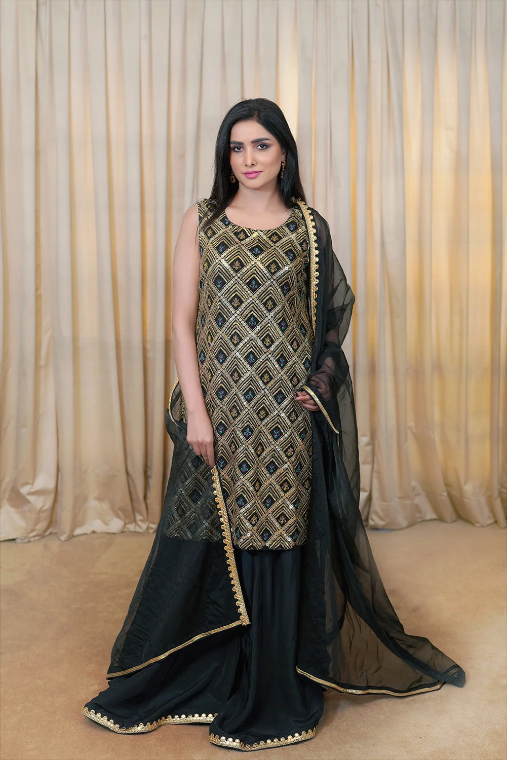 Classic in black, featuring a fully embroidered shirt paired with a perfectly tailored ijjar for a sleek, refined silhouette. Finished with a delicate organza lace dupatta, this ensemble embodies minimalism with effortless elegance.
