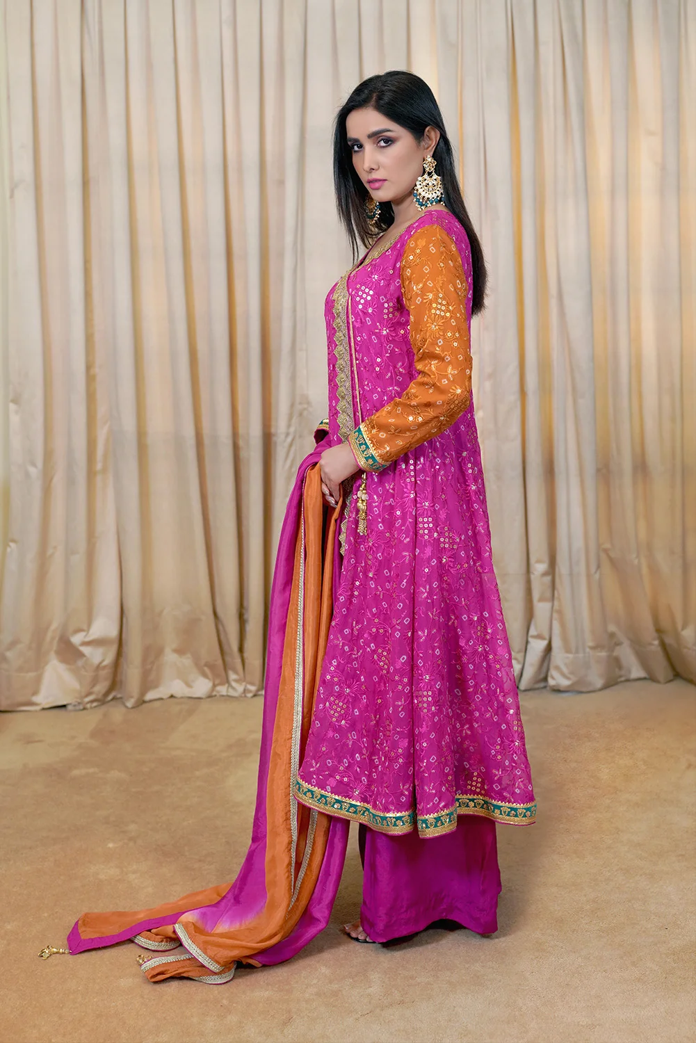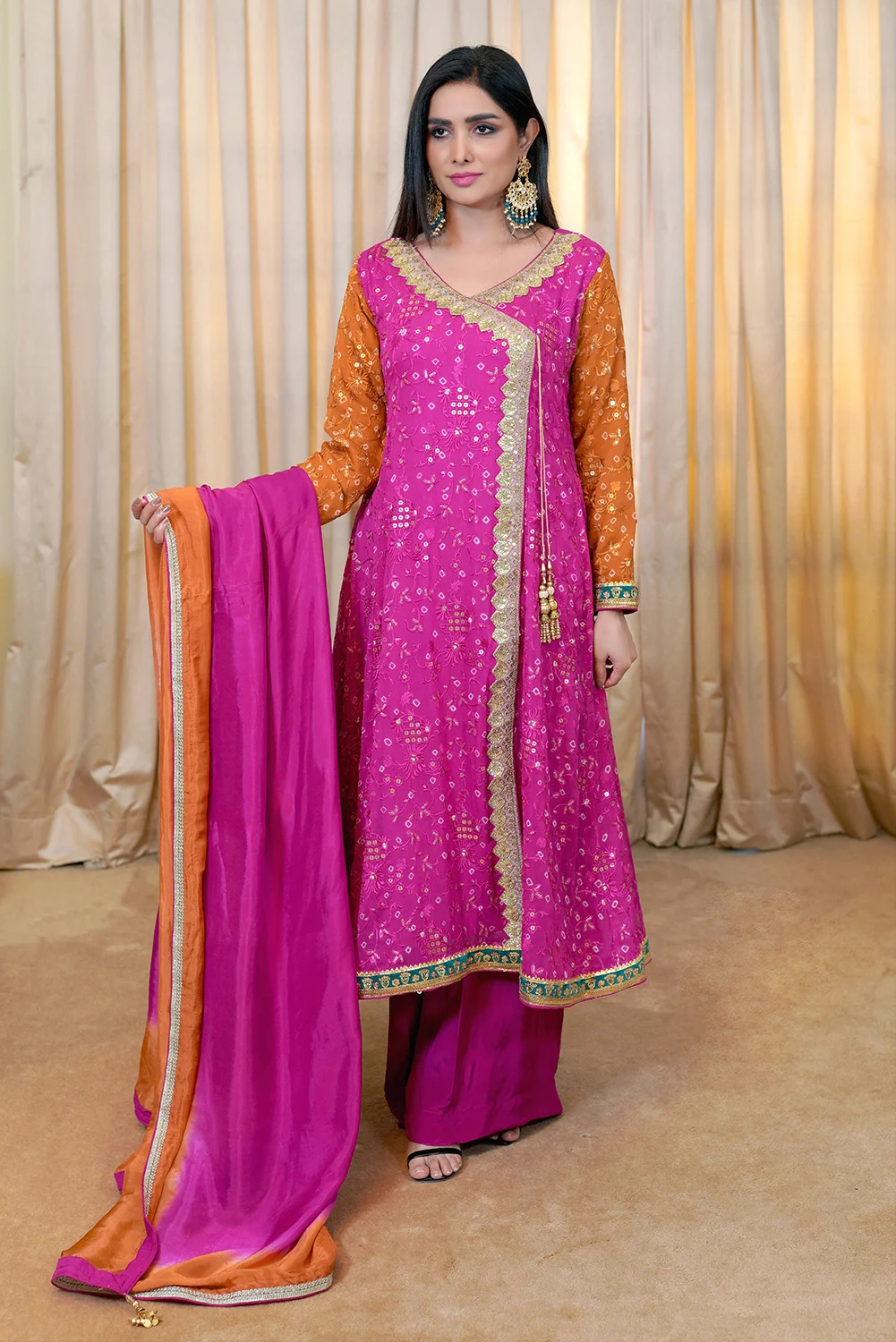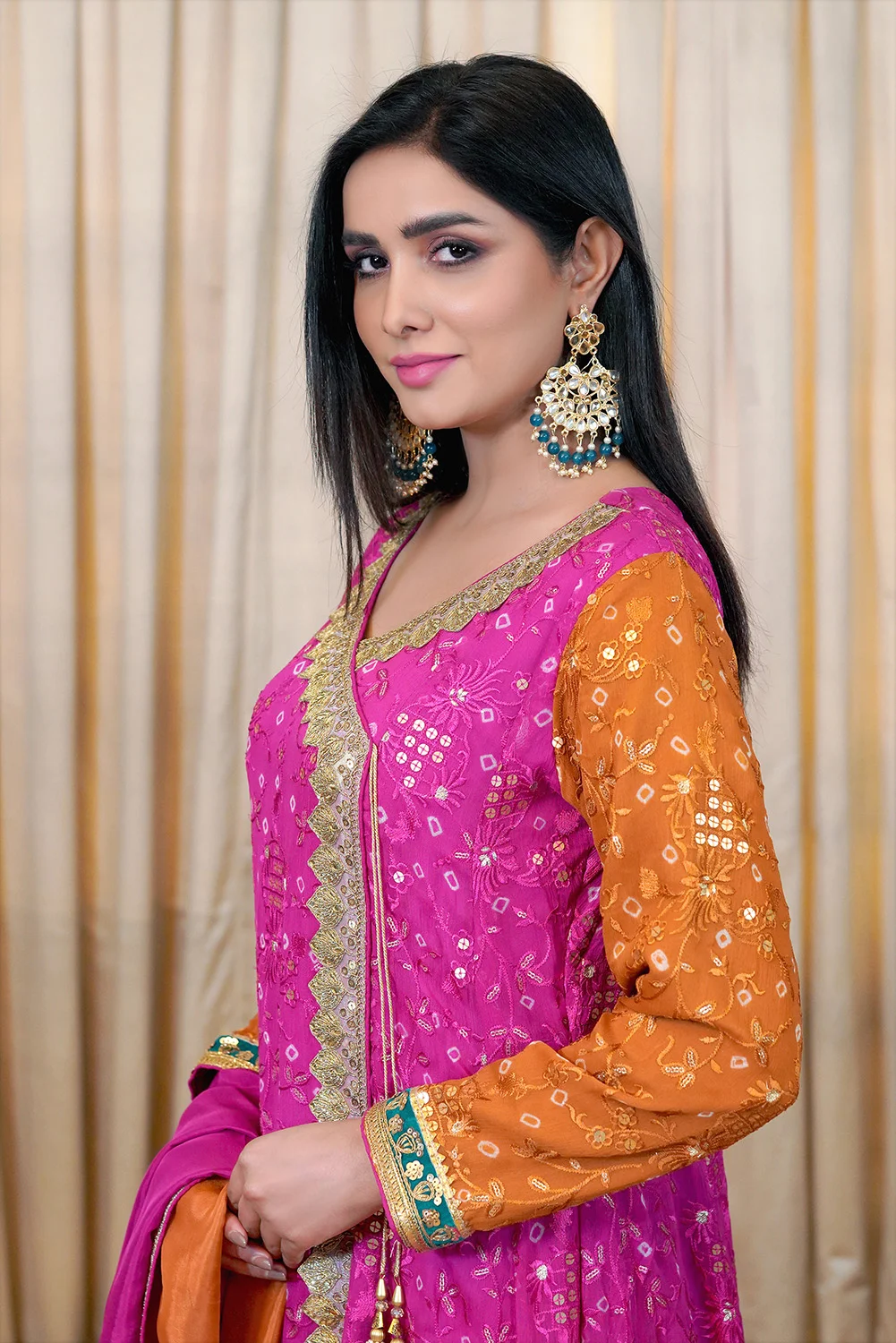 A timeless silhouette, redefined with quiet luxury. This chikankari chiffon chunri angharkha blends heritage craftsmanship with modern elegance.
