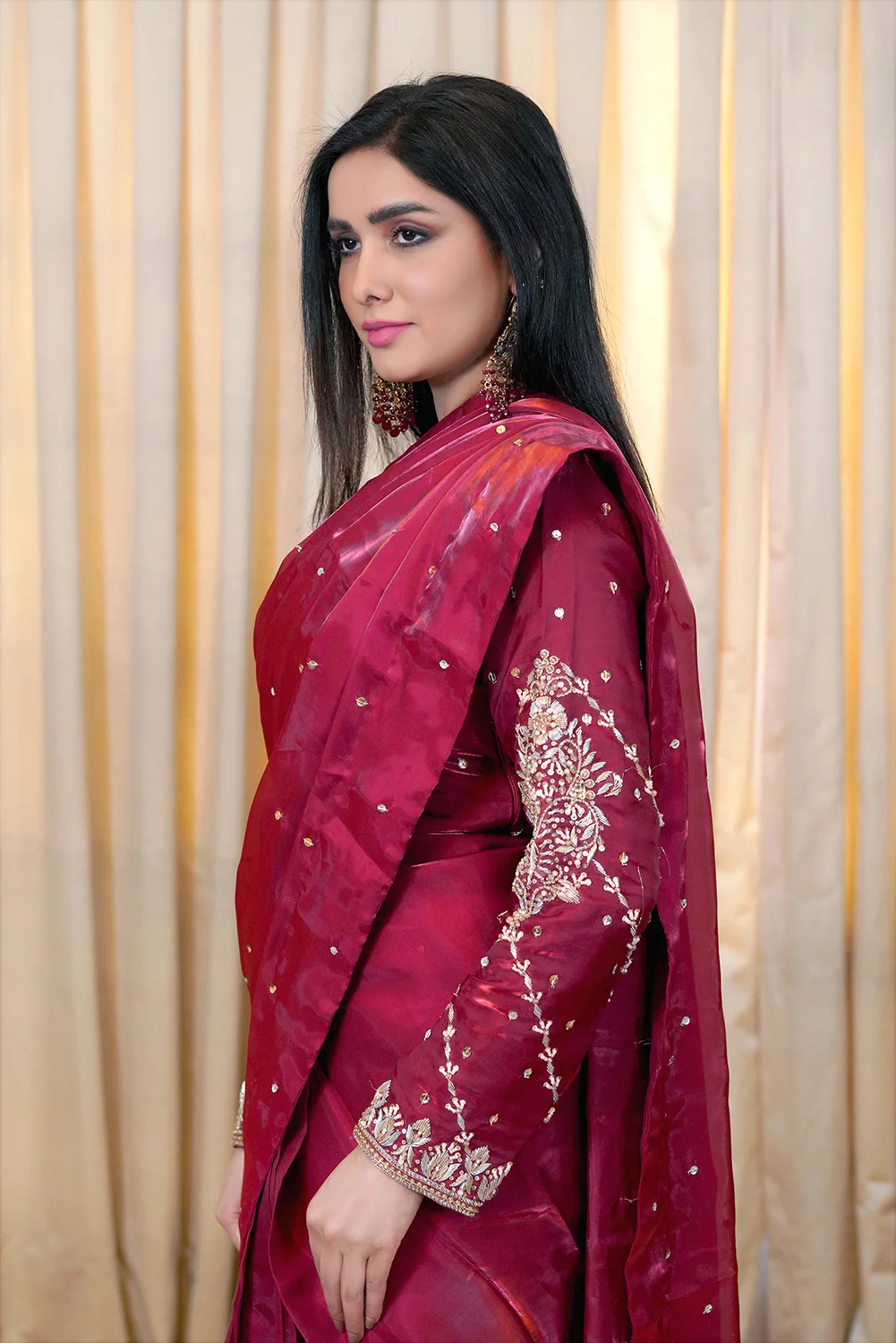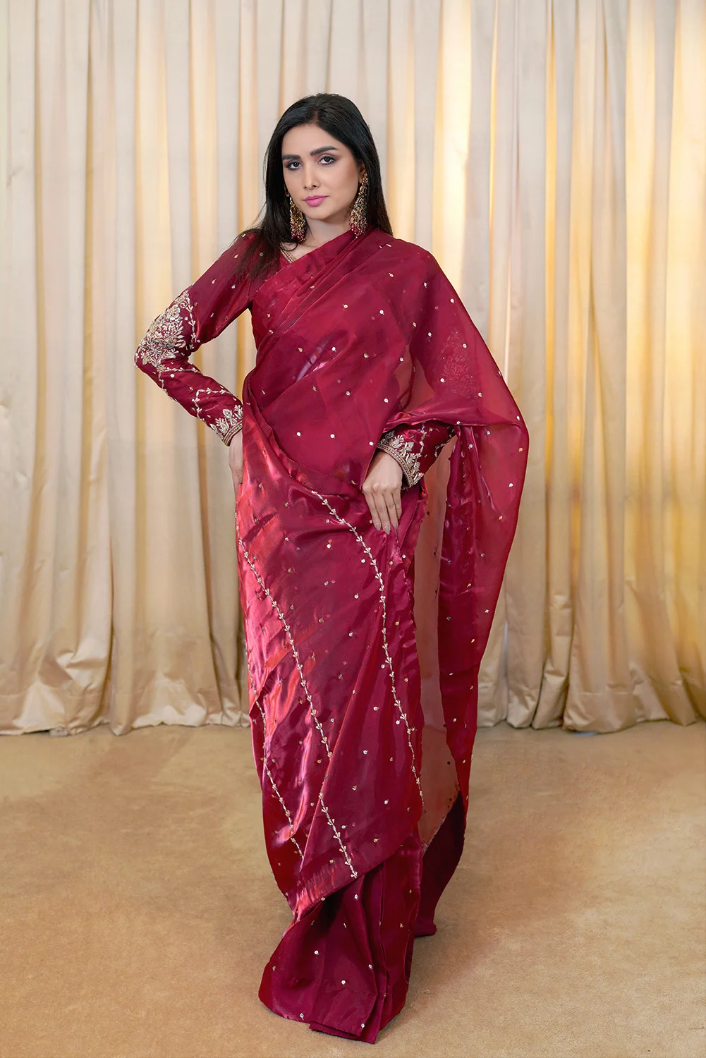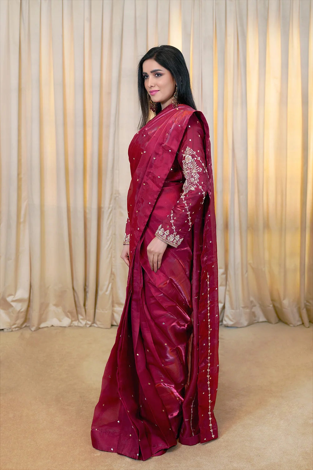 Scarlet Red Lava Silk saree with hand embellishments on pallu and blouse